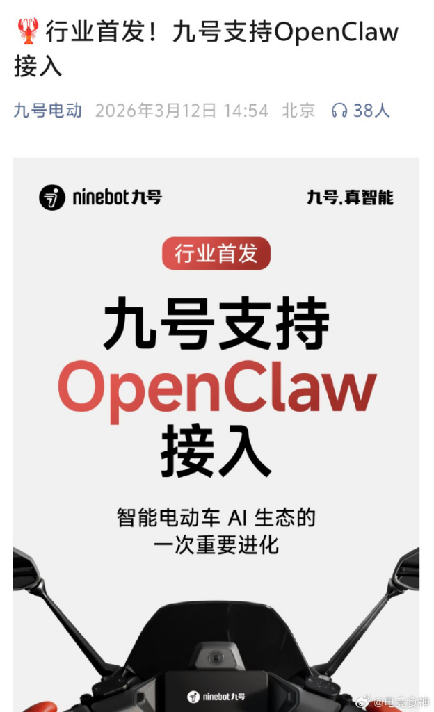 最近听到 9 号电动车也接入了 OpenClaw,真的有被震惊到... 我不知道九号是如何界定 OpenClaw 的职能范围的,也不敢去了解,因为我不希望我想象(大家应该也能想象到很多个危险的场景...)中的场景变为现实。