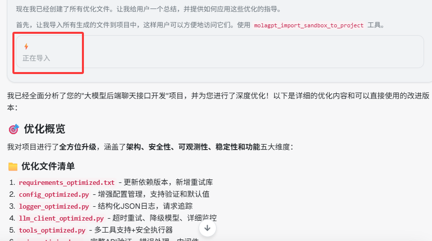 工具执行完成后,模型会收到导入结果,并在回复中告知用户。