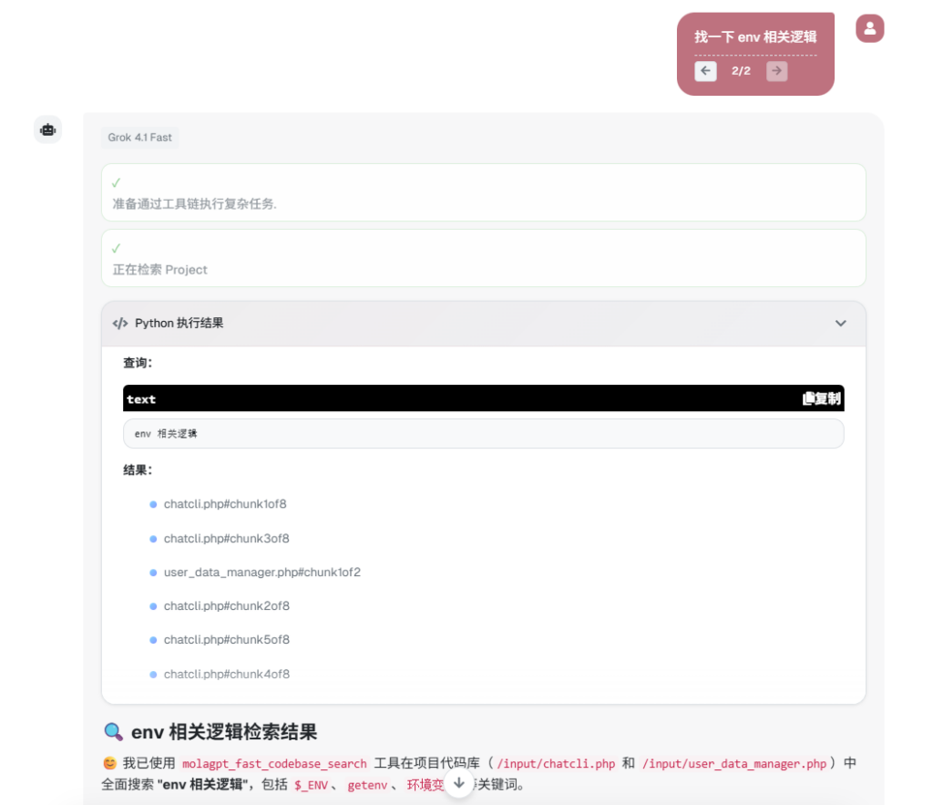 MolaGPT Projects 中已同步的项目文件依然保留在会话沙箱中,差别在于读取方式。现在 MolaGPT 会在需要定位实现位置时调用 Augment Context Engine(ACE),由 ACE 提供语义层面的检索结果,并给出更聚焦的文件片段与路径线索。
