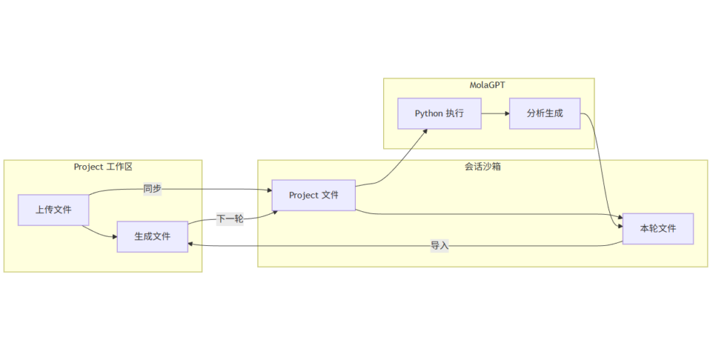 在旧版本中,MolaGPT Projects 存在一个让我自己都感到别扭的问题,虽然文件被"上传"到了 Project,但每次对话开始时,Python 沙箱都是一片空白。